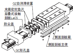 THK根据型号提供LM滚动导轨的防尘保护附件,例如以具有高耐磨损性的特殊合成橡胶制的末端密封垫片,以及能进一步提高防尘功效的侧面密封垫片和内部密封垫片等。并且,在使用环境恶劣的场所,还根据型号可以提供层叠式接触刮板LaCS和专用的伸缩防尘罩。